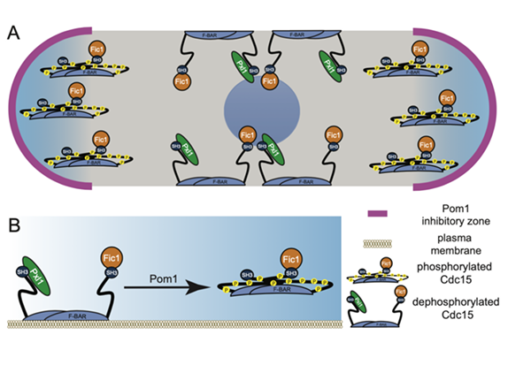 We have now found that the Pom1 is one of the kinases that directly phosphorylates Cdc15 on 22 sites. Pom1 is a DYRK kinase that is tip localized to inhibit CR formation at cell tips partly through the direct phosphorylation of Cdc15. By phosphorylating Cdc15, Pom1 inhibits Cdc15’s membrane-binding activity as well as its ability to bind Pxl1 at cells tips. However, Pom1 phosphorylation of Cdc15 does not regulate the ability of Cdc15 and Fic1 to interact. In either wildtype or mid1∆ cells, we propose that Cdc15 can bind membrane and Pxl1 to stabilize the CR only where Pom1 is not active (see figure below) (Bhattacharjee, Mangione, et al., 2019).