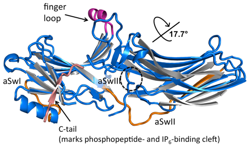Figure 1: Arrestin activation. Overlay of the N-domain of IP6-activated arrestin-3 (blue) with the secondary structural elements of basal arrestin-3 (grey with a pink C-tail) highlights the interdomain rotation. Activating sites include the finger loop, with the active, alpha-helical conformation in magenta, and phosphate binding to the cleft that binds C-tail in the basal conformation. Activation induces previously undescribed conformational changes in the distal aSw regions (orange). We hypothesize this is required for effector activation.