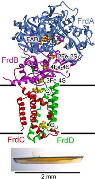 Figure 2: E. coli QFR. The complex contains four polypeptides (FrdABCD). In the figure, the flavoprotein is cyan, the iron protein is red, and the membrane proteins are colored green location of the membrane.