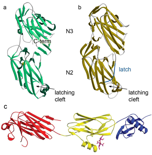 Figure 3: Structures of SRR adhesins. (a) Srr1 from S. agalactiae. (b) Srr2 from S. agalactiae. (c) GspB from S. gordonii colored by domain.