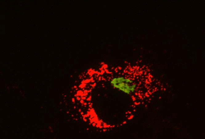The goal of this project is to utilize a variety of high-resolution live-cell imaging techniques to examine the effect that RASSF1A has on MT network organization and dynamics as well as its influence on other organelles in the cell; in addition, we are examining how these functions of RASSF1A subsequently affect MT-based processes, such as cell migration and polarity. The picture shows two distinct localizations of the MT-binding protein RASSF1A: segmental RASSF1A localization to peripheral MTs (indicated by white arrow), and RASSF1A-bound Golgi-derived MTs (indicated by yellow arrows). The Golgi is shown in green, RFP-RASSF1A is shown in red.