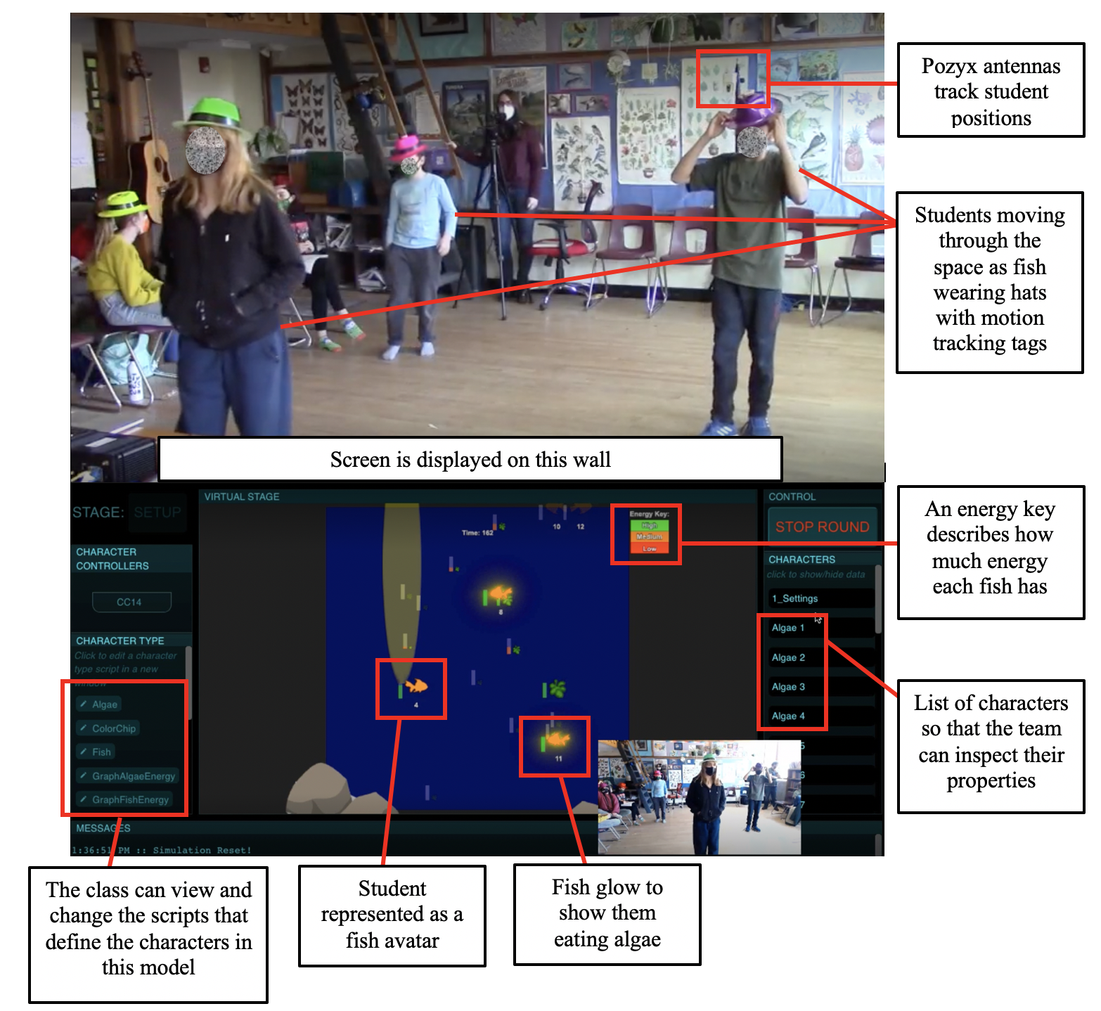 Below is an image of a recent implementation of using GEM-STEP. Here you can see children in the classroom pretending to be fish. As they do this, the GEM-STEP system tracks their locations using tags on their hats and uses that information to control fish in the simulation at the bottom of the image. This simulation is then projected for the students to see as they play. In this activity, the students are exploring how the fish in a pond ecosystem are dependent on the algae for survival, and how the algae are in-turn dependent on the sun. Our theoretical framework for embodied learning highlights how youth learn in this kind of activity by attending to both their individual embodied experience of moving around, and their social, collective experience of coordinating their movement as they explore this system.