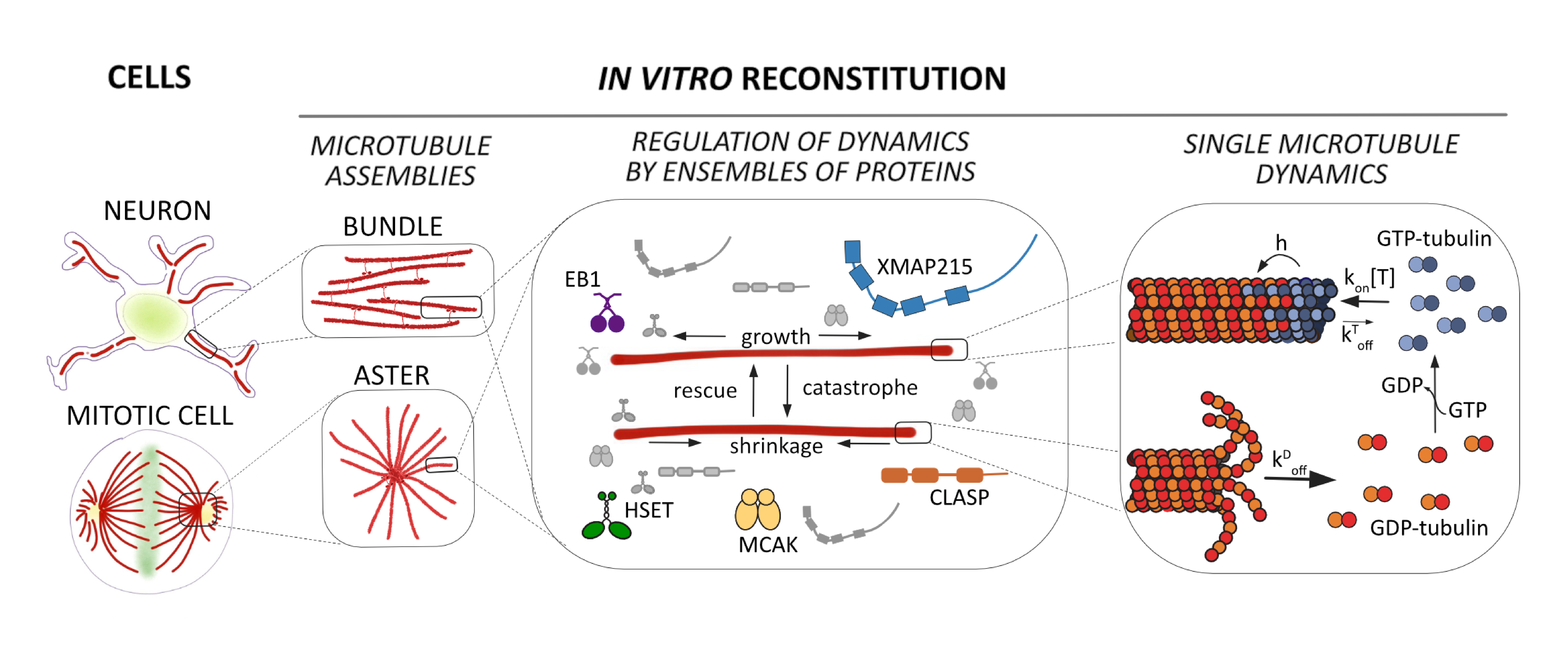 We are investigating the microtubule dynamic instability by combining biochemical in vitro reconstitution, single molecule studies, quantitative image analysis and theoretical modeling. We are especially interested in emergent behaviors that arise through collective effects of groups of proteins that regulate microtubule dynamics. By developing predictive models of polymer dynamics and testing them in controllable in vitro reconstitution assays, we take a bottom-up approach towards improving our comprehension of complex molecular systems. Combined with structural biology and live-cell studies, this approach provides an essential stepping stone for the understanding of large-scale, dynamic cellular structures. Because microtubules are a common target for chemotherapeutic agents and many of their regulating proteins are implicated in cancer and neurodegenerative diseases, quantitative, predictive models of microtubule regulation not only provide fundamental insight, but also have important medical relevance.