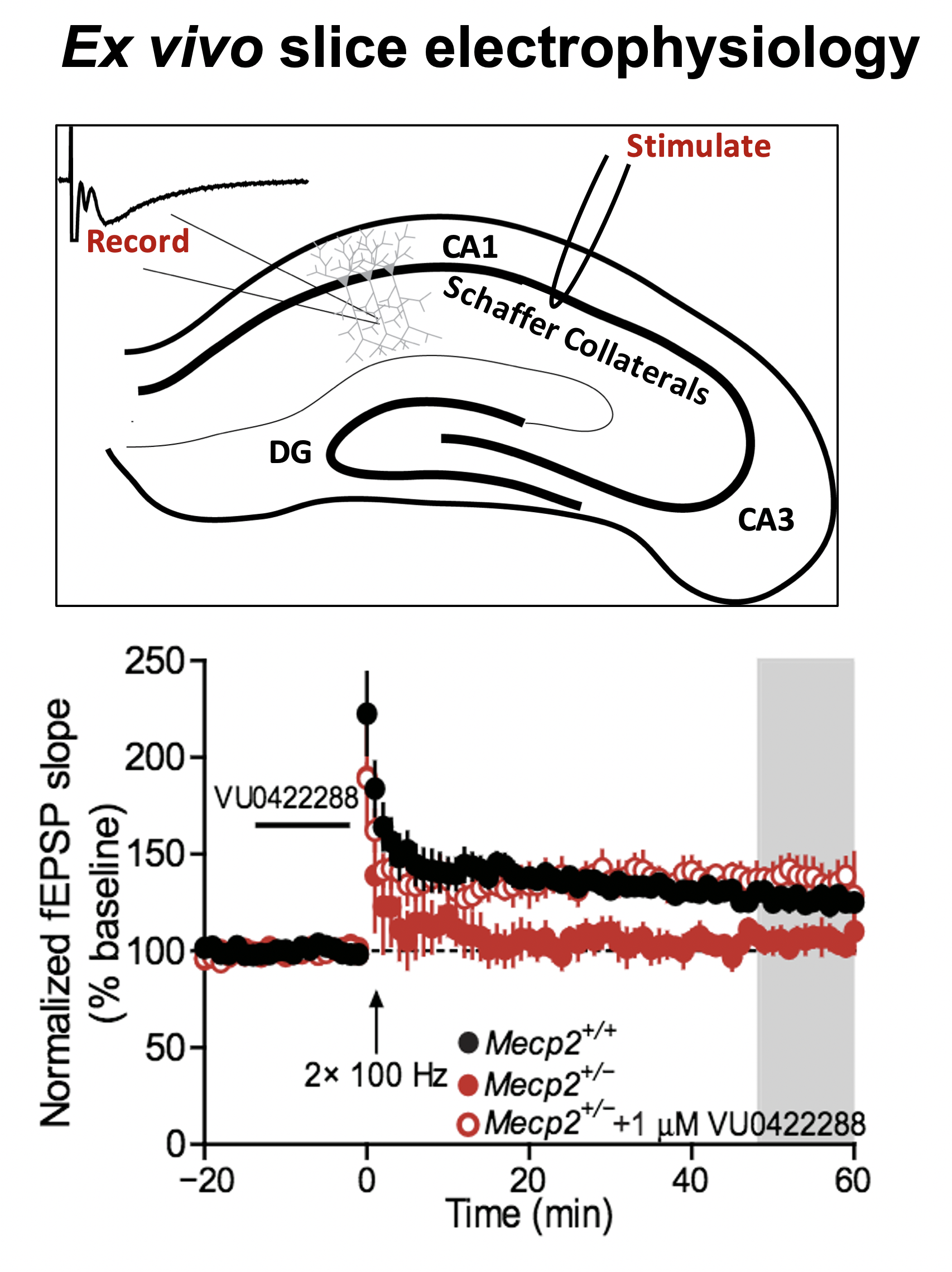 Above: Field electrophysiology recording at the hippocampal SC-CA1 synapse. High-frequency induced long-term synaptic plasticity (LTP) is decreased in Mecp2+/- mice, which is normalized with bath application of mGlu7 PAM VU0422288. (Gogliotti et al 2017 Sci Transl Med)