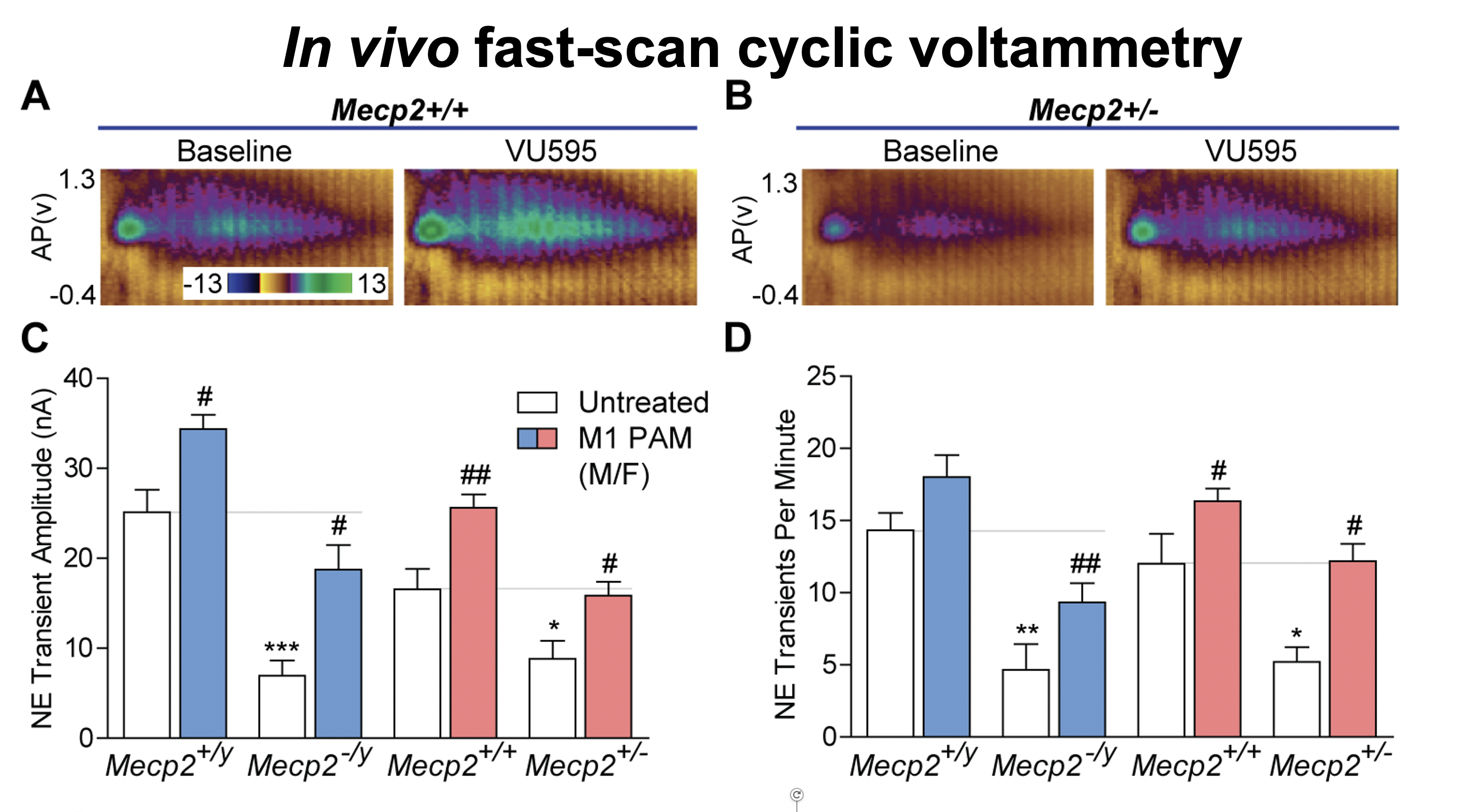 Below: Spontaneous norepinephrine (NE) release is measured in vivo using fast-scan cyclic voltammetry. Decreased NE release in RTT mice is normalized with M1 PAM VU453595 treatment.