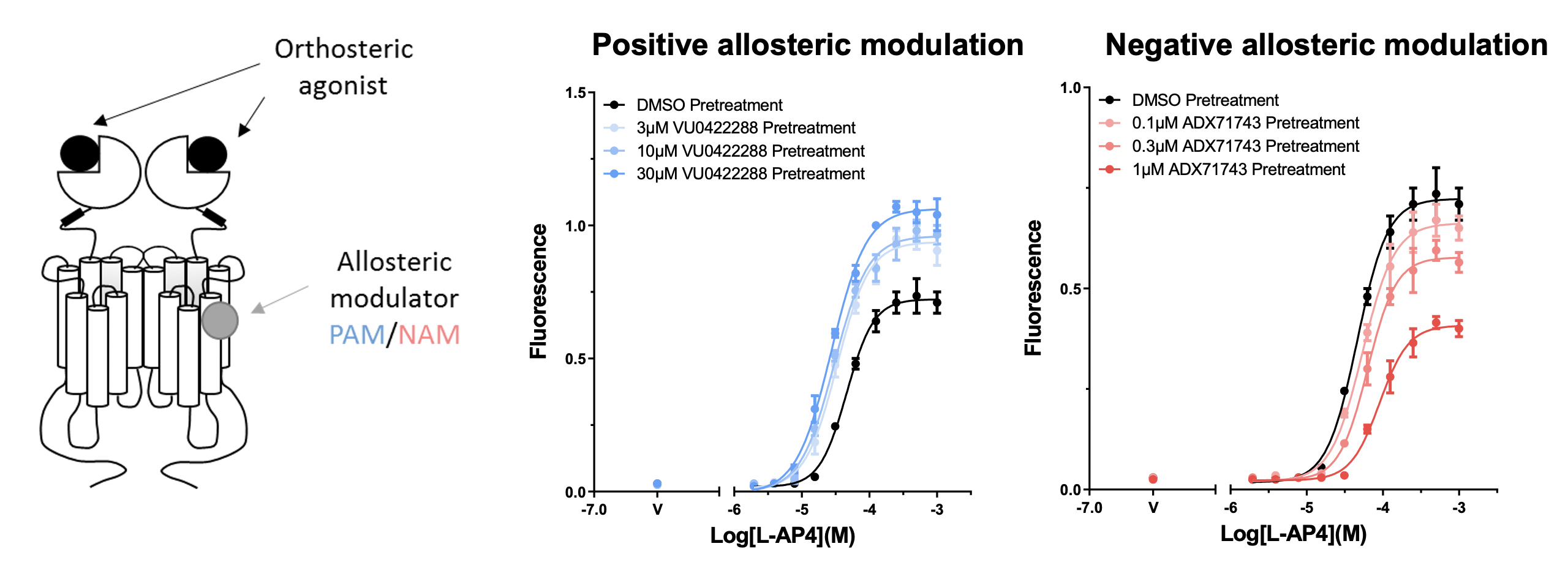 Schematic of a metabotropic glutamate receptor depicting the location of orthosteric and allosteric sites. At right are dose-response curves from a calcium mobilization assay where mGlu7-expressing cells were treated with agonist (L-AP4) with and without pretreatment with a positive allosteric modulator (PAM, VU0422288) and a negative allosteric modulator (NAM, ADX71743.)