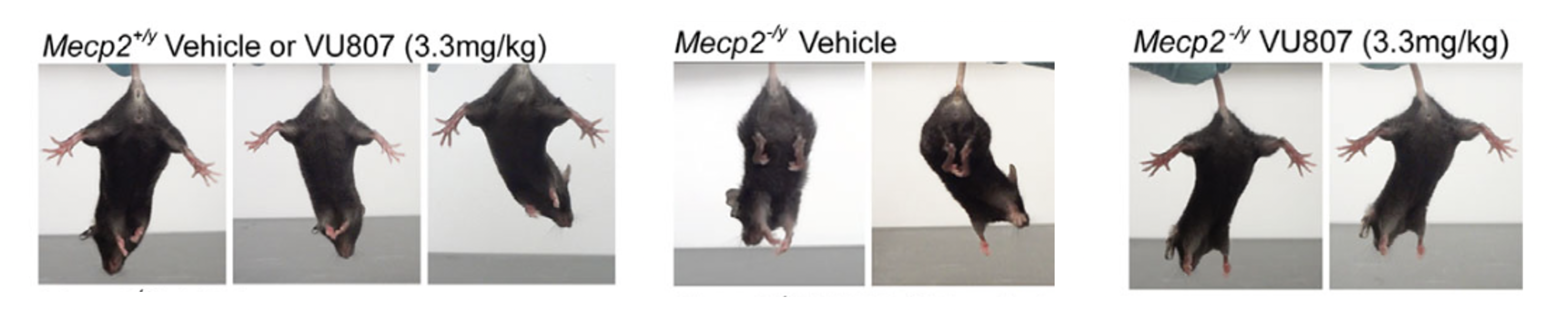 RTT mice (Mecp2-/y) exhibit hindlimb clasping. Treatment with mGlu5 PAM VU0462807 ameliorates the clasping phenotype. (Gogliotti et al 2016 Hum Mol Genet)