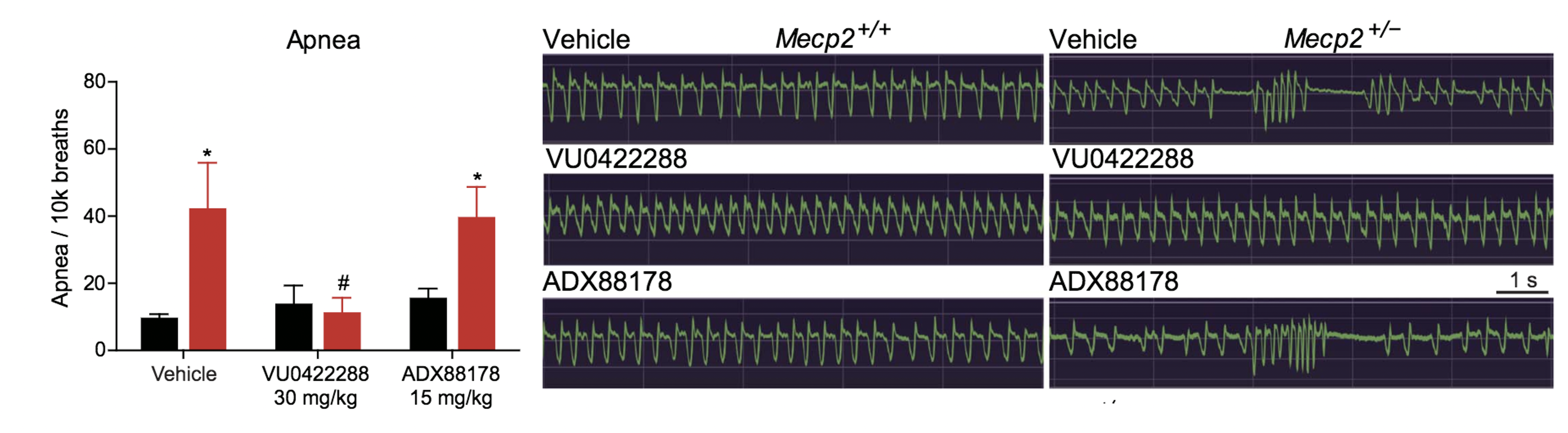 mGlu7 PAM VU0422288 attenuates apneas or breathing pauses that are observed in Mecp2+/- mice using a whole body plethysmography recording chamber. The mGlu4 and mGlu8 PAM ADX88178 has no effect. Sample traces on the right. (Gogliotti et al 2017 Sci Transl Med)