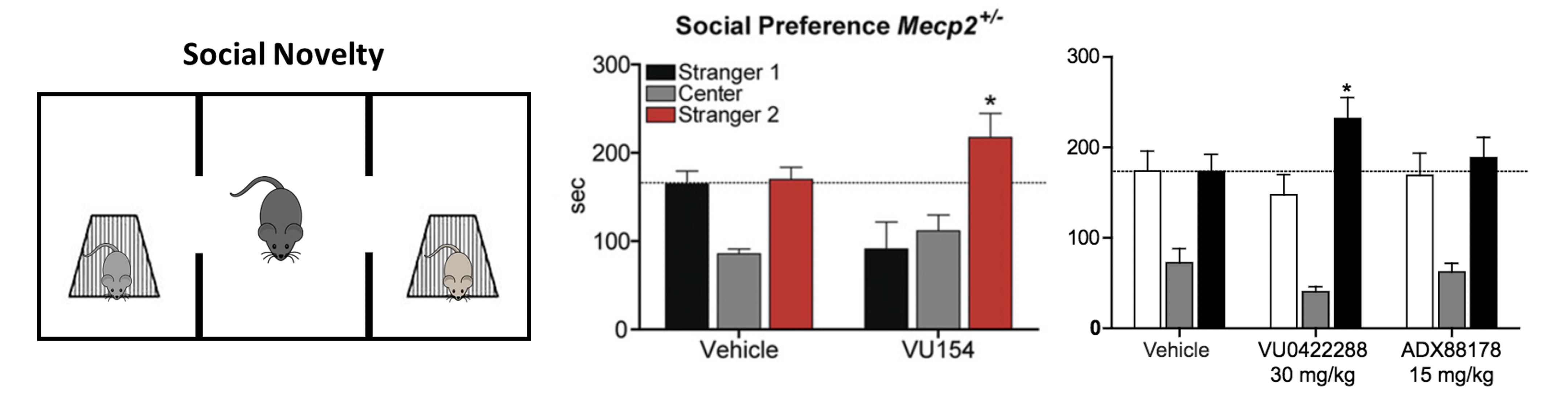 In both tasks, Mecp2+/- mice exhibit deficits, decreased percent freezing or no preference for the novel mouse. M4 PAM VU467154 and mGlu7 PAM VU0422288 both reverse these phenotypes.(Gogliotti et al 2018 J Pharmacol Exp Ther; Gogliotti et al 2017 Sci Transl Med)
