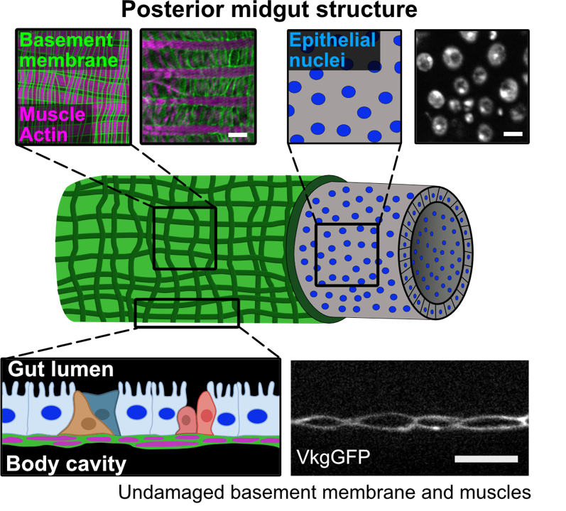Basement membrane is an important sheet-like extracellular matrix that mechanically stabilizes epithelia, muscles, and many other tissues. Basement membranes are damaged during tumor metastasis, kidney failure, and tissue wounds, and repair is critical for restoring tissue function. We are using several models to analyze basement membrane repair, including mechanical pinch wounds in larvae and feeding adult flies a matrix damaging agent. We find that basement membrane is repaired rapidly, forms a scar at the site of damage, and uses mechanisms that are a bit different from the mechanisms of normal basement membrane embryonic development. These studies suggest that basement membranes are significantly more dynamic than previously assumed. (Kimberly LaFever, Elkie Peebles, Can Yilgor, Bryant Humphries)